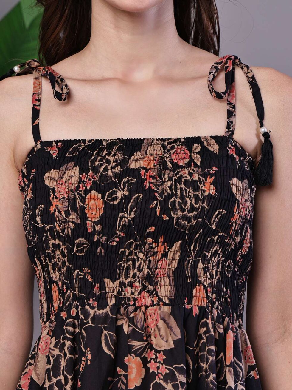Effortlessly stylish dress with a vibrant abstract print, tie-up shoulder straps, and a chic high-low handkerchief hemline ? perfect for casual days or evening gatherings.